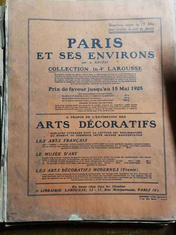 Paris, Les Nouvelles Littéraires, Librairie Larousse, impr. Georges Lang, à Paris 1925 In-4 31 x 23,5 cm. Reliure éditeur pleine toile bordeaux, titre or sur le dos et le premier plat, couvertures non conservées, 1025 pp., nombreuses illustrations, sommaire. Reliure défraîchie et restaurée avec accroc en tête de dos, charnières fendillées, intérieur assez frais.