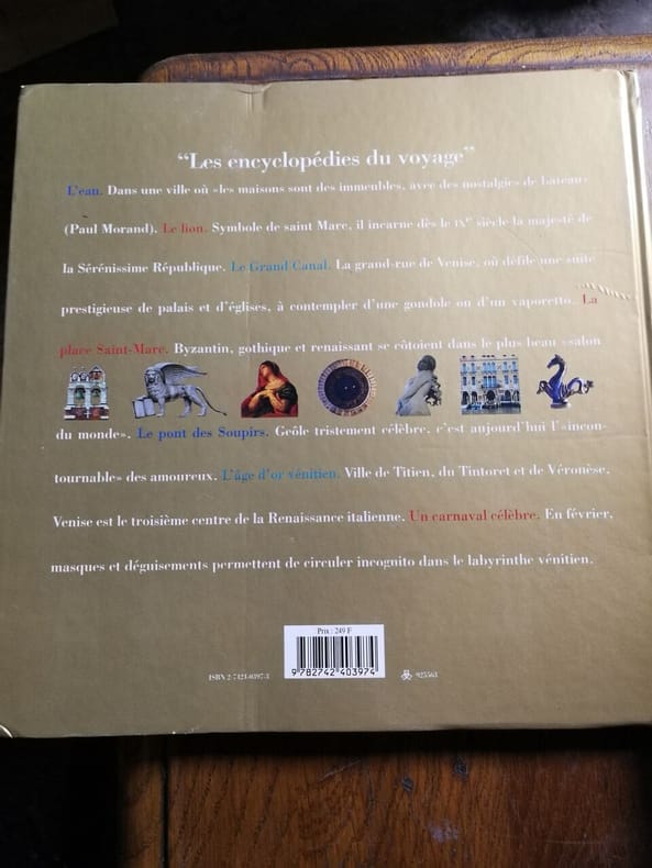 Venise François ANDREOLA 1828 in-16 broché un volume, broché (agraphé) crème in-seize Editeur (paperback in-16 editor)(16 x 10 cm), dos et couverture imprimés en noir, 1ère de couverture avec titre imprimé en noir dans un encadrement à décor floral gravé en noir, 4ème de couverture ornée d'une gravure du "Monument Colléoni à St-Jean et Paul" gravée en noir dans un encadrement à décor floral en noir, tête lisse, gouttière et tranche de queue non-rognées, Edition ornée de 2 plans dépliants gravés en noir + 19 gravures hors-texte en noir + 1 gravure en noir en 4ème de couverture, 404 pages + 3 pages intitulées "Oeuvres d'Antoine QUADRI sur Venise", 1828 Venise chez François ANDREOLA Editeur,