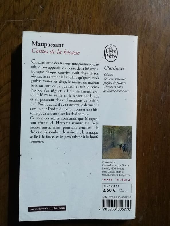 Le Livre de Poche Sans date. Recueil de seize nouvelles normandes de Guy de Maupassant structuré autour d'un rituel de chasse où le convive désigné pour manger la tête de bécasse doit raconter une histoire. Ces récits mêlent drôlerie et noirceur tragique et farce reflétant le pessimisme caractéristique de l'auteur