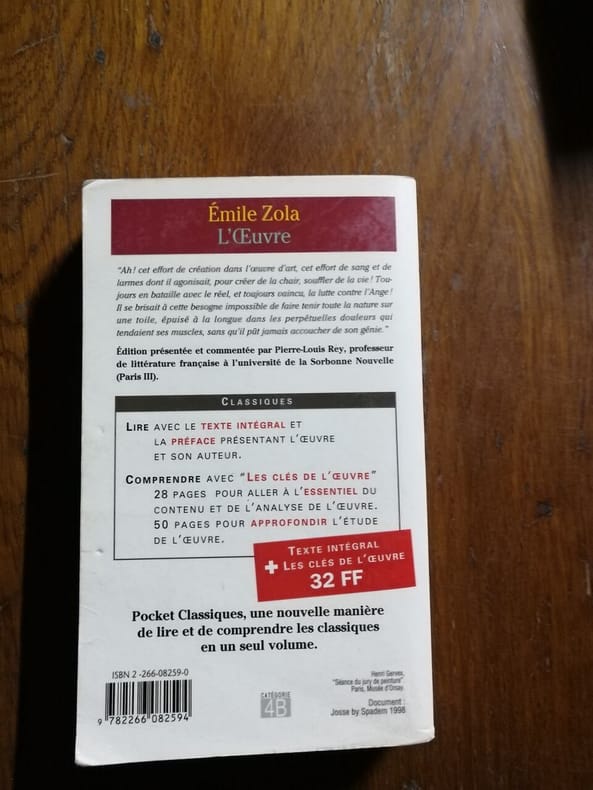 Pocket Sans date. L'Œuvre d'Émile Zola est un roman où l'auteur s'inspire fortement de sa propre expérience et de son entourage artistique. Il suit le parcours de Claude Lantier un peintre génial mais tourmenté incarnant l'avant-garde artistique et explore les souffrances de la création au détriment de la vie et de l'amour. Le livre dépeint à la fois l'enthousiasme d'une révolution artistique et le drame éternel de l'artiste aux prises avec son œuvre