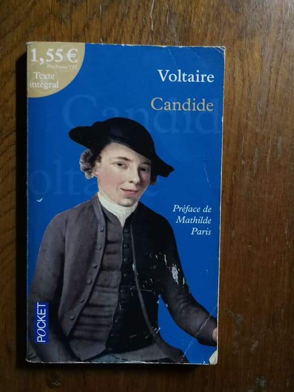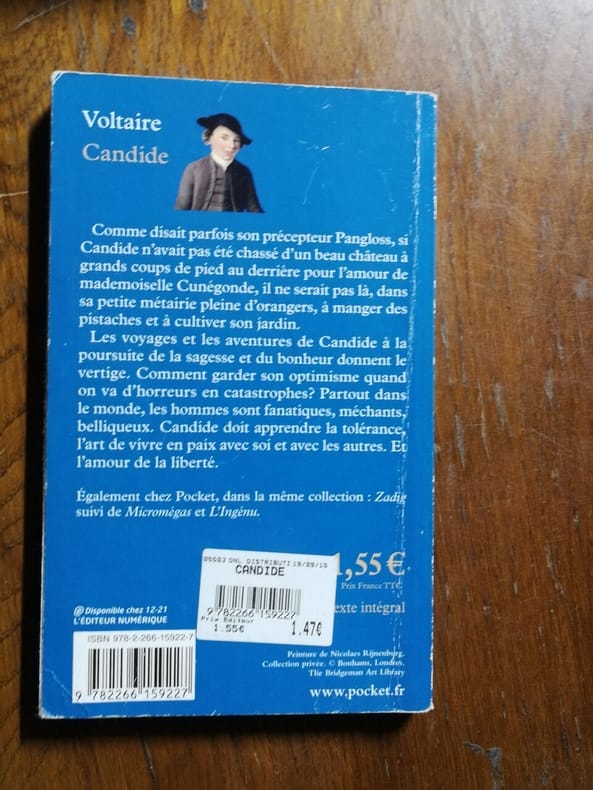 préface de Francisque Sarcey, illustrations de Adrien Moreau Candide est un conte philosophique. Il a pour personnage principal un jeune homme, Candide, qui vit dans un château avec sa cousine, Cunégonde, et son oncle. Il y est éduqué par un précepteur philosophe, Pangloss, qui suit la théorie de Leibniz, philosophe du XVIIe siècle, selon laquelle, notamment, « tout est pour le mieux dans le meilleur des mondes possibles ». Candide adhère d’abord à cette idée ; mais lorsque son oncle le chasse du château après l’avoir surpris en train d’embrasser Cunégonde, la vie va lui faire revoir cette opinion. Candide va en effet traverser une série de péripéties qui seront autant d’épreuves. Il se bat contre les Abares et découvre les horreurs de la guerre ; il assiste à la mort de milliers d’hommes et de femmes lors du tremblement de terre de Lisbonne ; il est condamné à mort injustement et en réchappe comme par miracle ; il découvre la manière cruelle dont sont traités les esclaves noirs, et finit par se réfugier en Turquie. Sur son chemin, il perd et retrouve tour à tour Pangloss et Cunégonde. A la fin du conte, ils vivent tous ensemble en Turquie et se contentent de « cultiver leur jardin », c’est-à-dire de s’occuper de leurs affaires privées sans plus se mêler du monde. « Il faut cultiver son jardin » est en effet le mot final du derviche, un mystique et sage de confession musulmane. Les principaux thèmes de cette œuvre sont ainsi le bonheur, la justice, l’ordre du monde et la politique. volume in-4, 255x170, jolie reliure, dos à nerfs, tranches de tête dorée, bel état intérieur, 174pp, couvertures d'origines conservées, coins lg. frottés, état intérieur neuf. Paris Jules Tallandier ( collection, " Les chefs d’œuvres de l'esprit " ), sans date, vers 1900 ref/241