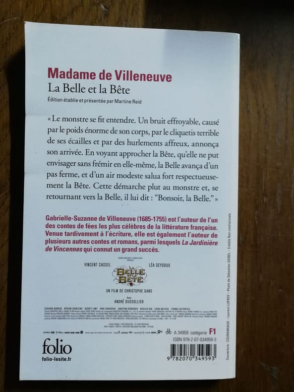 " Le thème de la métamorphose dans le Cabinet des fées, contes de Mme de Villeneuve, Mme d'Aulnoy, Mme Fagnan, Mme Leprince de Beaumont et Duclos, choisis et présentés par André Bay, comprenant les deux versions de La Belle et la Bête, avec le scénario du film de Jean Cocteau et des notes biographiques. Illustré d'images parisiennes et d'un dessin de Boucher gravé par Cochin ".