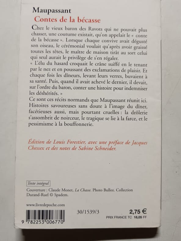 Le Livre de Poche Sans date. Recueil de seize nouvelles normandes de Guy de Maupassant structuré autour d'un rituel de chasse où le convive désigné pour manger la tête de bécasse doit raconter une histoire. Ces récits mêlent drôlerie et noirceur tragique et farce reflétant le pessimisme caractéristique de l'auteur