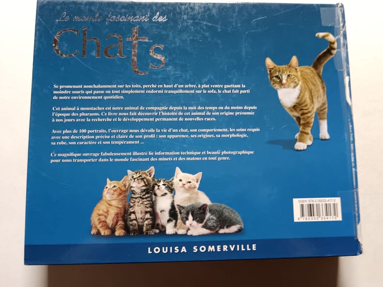 Comment élever les chats et les chatons. Histoire du chat. Morphologie et chirurgie félines. Psychologie du chat. Races à poil long et races à poil court. Siamois et autres races exotiques. Vedettes de la télévision et du cinéma. Magie orientale... Classification Dewey : 636.8-Chats