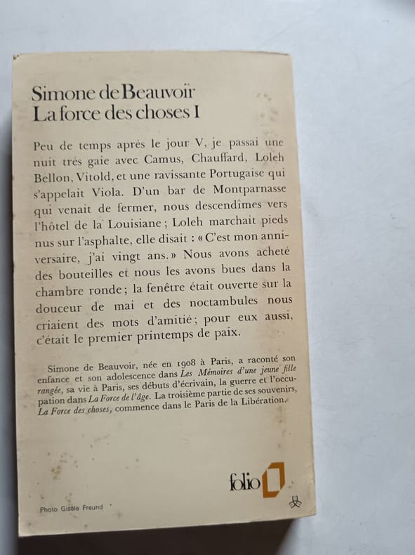 folio Sans date. « La Force des choses » est le troisième tome de l'autobiographie de Simone de Beauvoir. Elle y relate les années qui suivent la Libération de la France jusqu'aux années 1960 évoquant ses rencontres ses lectures ses réflexions quotidiennes son premier voyage aux États-Unis en 1945 ainsi que ses relations avec Nelson Algren et Claude Lanzmann. C'est une chronique confessionnelle de sa maturité explorant à la fois son destin personnel et les bouleversements de son époque