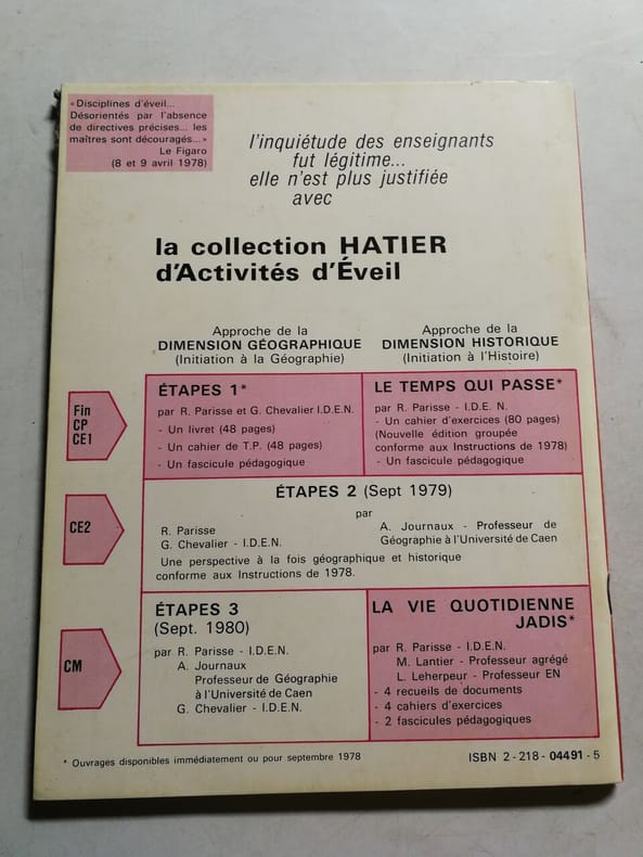 Hatier Sans date. Manuel scolaire intitulé 'Le Temps qui passe' de René Parisse publié par Hatier en 1978. Il s'agit d'un fascicule pédagogique d'éveil à l'histoire destiné aux élèves de fin de CP et de CE1 (C.E. 1re année) comprenant des illustrations de Pierre Dessons et proposé sous forme de cahier d'exercices