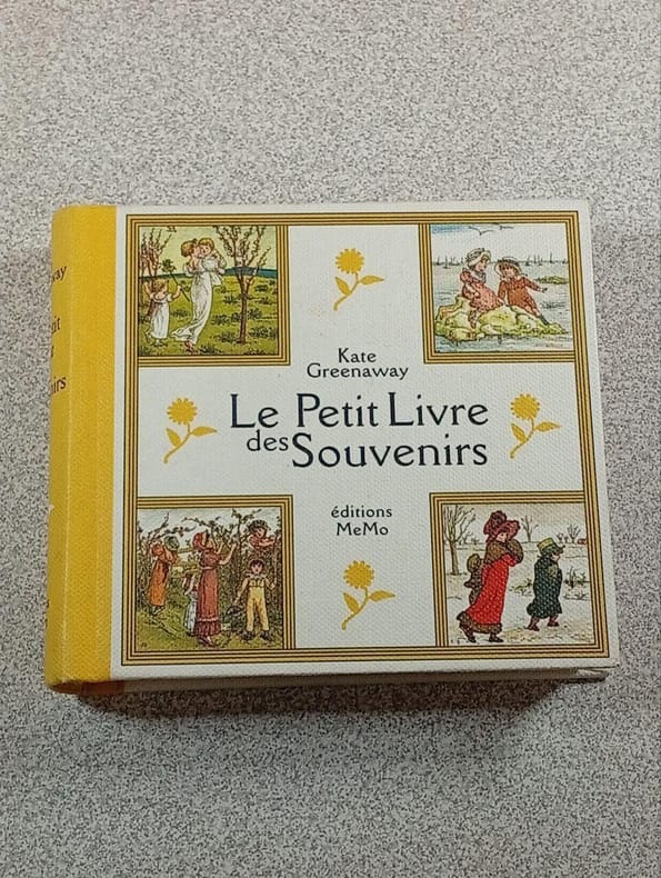 1888 cartonné gris entoilé éditeur in-vingt-quatre carré (grey hard-back percale editor in-24), dos long sans titre - filets verts (spine without raised bands without title) - plats illustrés en couleurs (cover illustrated in colours), toutes tranches jaunes (all yellow edges), illustrations de Kate Greenaway, 127 pages, sans date (no date) (1888) à Paris Librairie Hachette et Compagnie,