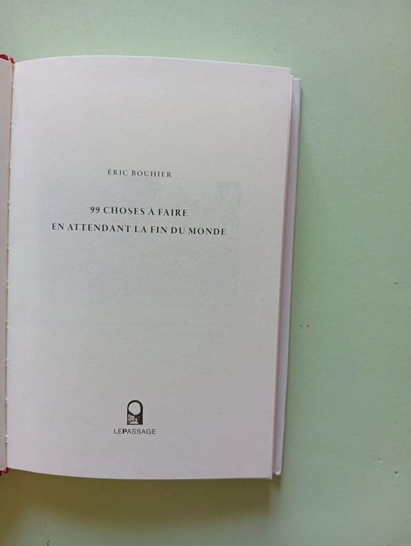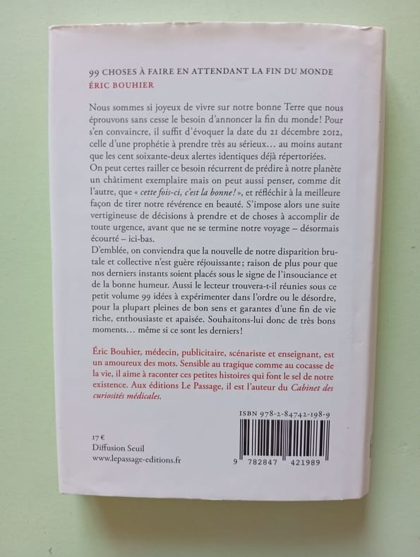 LE PASSAGE 2012 146 pages 12 2x1 8x17cm. 2012. Broché. 146 pages. Un essai humoristique et philosophique qui propose 99 idées et activités à expérimenter dans l'ordre ou le désordre pour mener une vie riche et apaisée face aux annonces récurrentes de fin du monde. L'auteur s'appuie sur l'exemple de la prophétie du 21 décembre 2012 pour railler notre fascination pour l'apocalypse