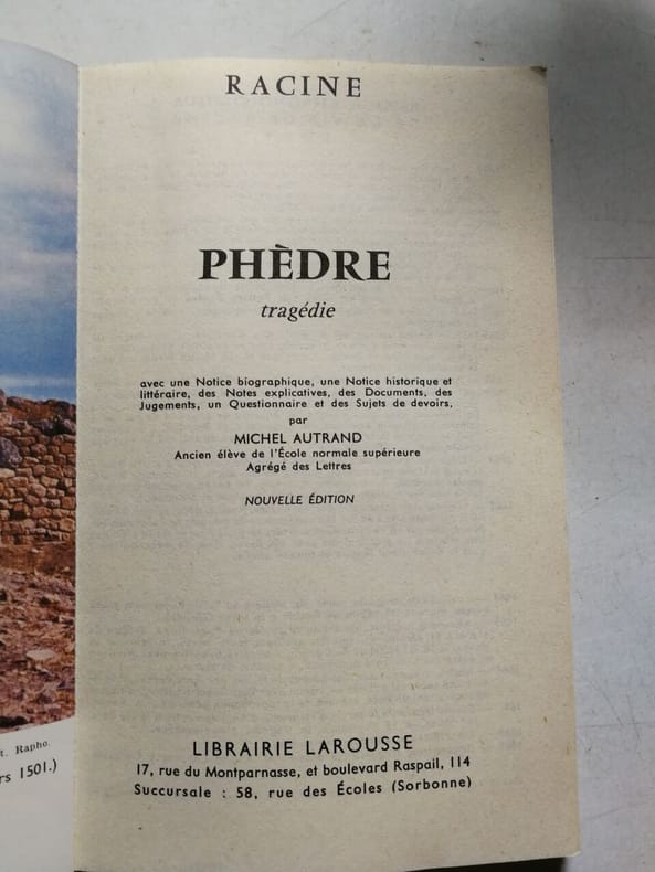 Phèdre. Tragédie. Texte conforme a l'édition des grands écrivains de la France. Avec une notice biographique, une notice littéraire et des notes explicatives par René Vaubourdolle, ancien élève de l'école normale supérieure, agrégé. 85p