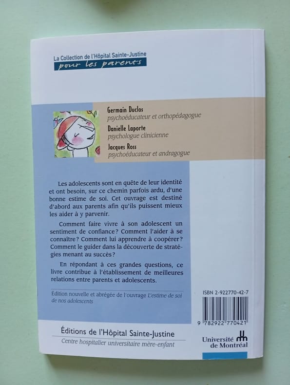Hôpital Sainte-Justine 2002 90 pages 12x1x17cm. 2002. Poche. 90 pages. Ce guide pratique destiné principalement aux parents vise à les aider à soutenir le développement d'une bonne estime de soi chez leurs adolescents. Il propose des questionnaires des exercices et des notions théoriques accessibles pour améliorer la connaissance de soi la communication et la relation parent-adolescent basée sur la compréhension et le respect mutuel