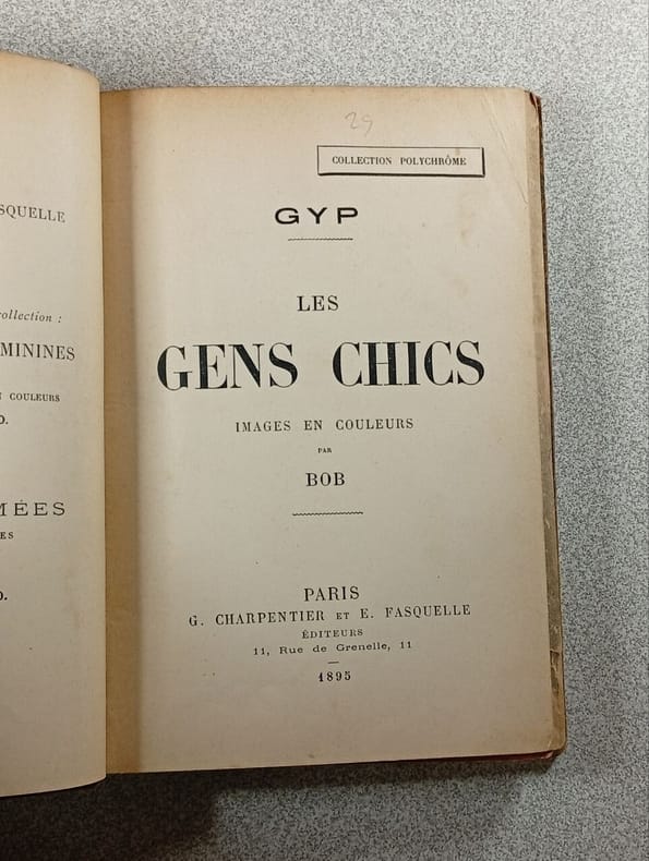 L’AUTEUR : d’où vient ce pseudonyme, Gyp qui claque comme une déflagration ? La majorité penche pour la contraction de ses deux prénoms : Gabrielle et Sibylle ( dans ce cas, d’où vient le « p » ?). Est-ce « une onomatopée qui sonne anglais », ou « On notera la masculinité du pseudonyme » (Patricia FERLIN ) ; ou « une abréviation des gypsophiles » (« christian.jannone ») , petits végétaux aux fleurs blanches poussant sur des terrains gypseux et non pas les amis de gypsies ! Et d’où sort le petit « Bob », titre de son premier roman? Mieux vaut reconnaître son ignorance que d’inventer des fables : ne pas se mettre Martel en tête. Plus sûres sont ses options politiques bien tranchées, dont on n’a retenu que son féminisme très nuancé et son antisémitisme sans nuance : sa collaboration avec Drumont, antisémite génétique, anti- dreyfusard viscéral. LE LIVRE : « Les gens chics », en cinq courts récits dialogués, nous offre une peinture peu ragoûtante de cette aristocratie décadente, dans laquelle sont étroitement mêlés légitimistes pur jus, orléanistes régicides, arrivistes bonapartistes, tous plus ou moins démunis (paraître ou ne pas être), tous unis dans le même rejet des derniers arrivants, ces métèques étrangers apatrides mais fortunés, qui cherchent à tout prix, non la fortune, ils l’ont, mais la respectabilité et les honneurs (paraître ou ne pas être). Que les fils de hobereaux désargentés aillent se « refaire » grâce à des unions hétérodoxes, passe encore, mais, quand ces intrus viennent leur piquer leurs filles, quel scandale ! L’ILLUSTRATION : « Images … coloriées de (couverture), …en couleurs par (titre) le petit BOB » [autre pseudonyme de l’auteur]: couverture, 92 dessins signés [à double page, à pleine page, fausses doubles pages (deux planches signées, en vis à vis), vignettes et culs-de-lampes], quelques uns non signés. Gyp avait débuté dans la peinture ; les caricatures données ici ne sont pas à la hauteur de sa prose ; elle maniait beaucoup mieux la plume que le crayon : on ressent quelque trouble en croisant des naseaux à satiété ; opinion qui n’est pas toujours partagée, certain confrère admirant « cette « sublime couverture (…) illustrée de magnifiques dessins en polychromie » [V.S., membre (unique ?) du Syndicat des Cabillauds…. C’est mieux que le Syndicat des Requins ! L’ÉDITION : Les « gens chics » parurent dans la « Collection polychrome », dont c’est le troisième volume, après « Un siècle de modes féminines » (1794-1894) et « Emaux et Camées » de Th. Gautier (1895). L’éditeur habituel de Gyp était Calmann-Lévy,maison créée en 1836, sous le nom de Michel Lévy frères, par Michel Lévy(1821-1875) et Kalmus (francisé en Calmann) Lévy (1819-12891) ; après le décès de Michel, l’intitulé devint Calmann-Lévy, que les enfants de Kalmus perpétuèrent.. Dans quelles conditions s’opéra ce changement ? L’historien Jean-Yves MOLLIER, spécialiste du monde de l’édition, dans un article (www.lexpress.fr/actualite/idees-et-debats) en date du 02/07/2021, consacré au récent limogeage de « Z » par son éditeur parisien, auquel le journaliste pose la bonne question : « pourquoi il est si rare qu'un éditeur abandonne un auteur politique ? », répond de façon péremptoire : « Je ne vois qu'un cas à peu près comparable : en pleine affaire Dreyfus, la très célèbre romancière GYP - alias la comtesse de Janville - a dû changer de maison, à la demande de son éditeur, Calmann-Lévy, qui refusait de continuer à la publier en raison de sa veine violemment antisémite [note *]. Elle est allée chez Flammarion [note **]. Mais une fois l'affaire terminée, elle a pu revenir sans souci chez Calmann-Lévy ». [*] Partiellement faux : de 1894 à 1901, on ne dénombre pas moins de vingt-six titres nouveaux de Gyp, non comprises les rééditions (source BNF-Opale). Seuls furent prohibés les ouvrages au caractère antisémite prononcé : business is business. La rupture ne sera effective que vers la fin de l’Affaire : de 1902 à 1906, pas de traces de Gyp chez Calmann-Lévy. [**] Flammarion n’apparaîtra qu’en 1897 ; Gyp cohabitera avec ces deux éditeurs - et accessoirement- avec quelques autres, jusqu’à sa fin (1932). CRITIQUE (à l’époque) : La production littéraire de Gyp fut très importante : plus d’une centaine d’ouvrages à succès, à vocation … alimentaire : elle était célèbre aussi pour sa vocation féministe on la voit sur une carte postale-texte daté du 28/10/1903- photographiée en pied, encadrée de deux médaillons, portraits d « Marni » (Jeanne Barousse) et …Séverine) : elle tenait salon, ce qui coûtait fort cher ! Elle recevait essentiellement des gens de sa caste, des gens de bien (version Henri Guillemin, c'est-à-dire des gens possédant des biens). Infréquentable, mais fréquentée ! En 1932 paraitra la onzième – et dernière- édition (du 121° au 140° mille) du chef d’œuvre de la censure littéraire et cléricale qui inondait le marché depuis 1904, le célèbre « Romans à lire et romans à proscrire », de l’abbé Louis Bethléem, [note*] dans lequel Gyp, ce qui n’est pas fréquent, a droit à plusieurs pages (305-308). Sa production est classée dans la troisième partie, « Romans mondains », dans lesquels elle peint le « grand monde ». Le style est « badin, mordant (…). Ses œuvres ont « gypanisé » toute une société », bien qu’elle « se comporte comme une gourgandine littéraire ». En conséquence, « peut-on permettre la lecture de Gyp aux gens du monde ? Sans doute (…), car elle sait dire des vérités. Elle les dit drôlement. Or la vérité (…) qui fait rire n’a pas de résultats malsains ». Et le bon abbé de relever, malgré tout, l’antisémitisme de l’auteur dans deux ouvrages : « Israël », « roman antisémite », 1898 et 