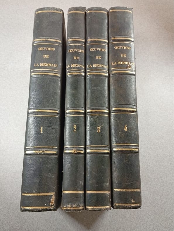 SOMMAIRE DE LA TOMAISON : Tomes 1 + 2 + 3 + 4 : Essai sur l'indifference en matiere religion / Tome 5 : Defense de l'essai en matiere de religion / Tome 6 : Reflexions sur l'ETat de l'Eglise / Tome 7 : De la religion considerée dans ses rapports avec l'ordre politique et civil + Tome 8 : Melanges religieux et philosophiques + Tome 9 : Progrès de la Revolution et de la gerre contre l'Eglise - *suivis des deux lettres a l'Archeveque de PAris + Toem 10 : Journaux - ou extraits du memorial catholique et de l'avenir. Classification Dewey : 270-Histoire et géographie de l'Eglise
