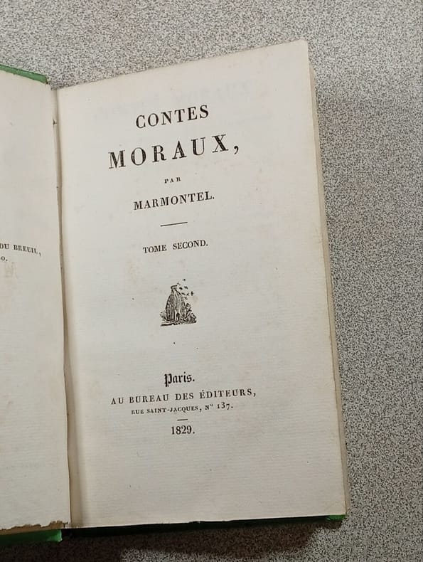 Titre : Contes moraux - Tome troisième Auteur : Marmontel Jean-François Éditeur : Richard, Caille et Ravier Lieu : Paris Date : An IX [1800-1801] Tome : 3 Format : petit in-12 Dimensions : environ 13.5 x 9 cm Reliure : Plein veau marbré d'époque, encadrement doré sur les plats, dos lisse orné de filets et fleurons dorés, pièce de titre rouge, médaillon noir avec le chiffre 3 au dos Illustrations : 1 frontispice gravé sur cuivre légendé « La mauvaise Mère » (mention « Tom. III » en tête) Langue : Français État du livre : Moyen - dos très abîmé avec importants manques de cuir en tête, coiffes frottées et ébréchées, mors usés, coins émoussés, petites épidermures aux plats. Intérieur propre pour l'âge malgré quelques rousseurs éparses, petites taches et brunissures, marge du titre avec petite tache. Reliure encore fonctionnelle, cahiers tenus Notes : Édition du Directoire/Consulat d'un classique des Lumières. Jolie gravure en frontispice. Petit format agréable