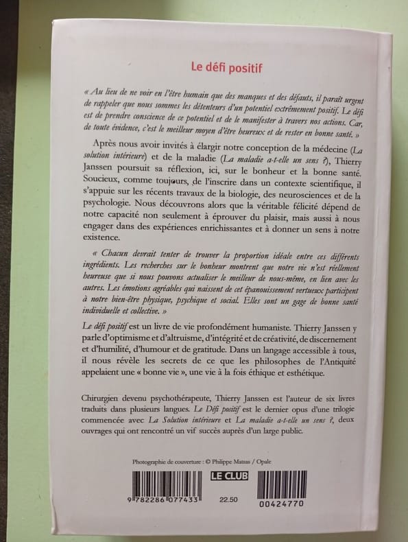 Voici le troisieme tome d?une trilogie commencee avec La solution interieure. Vers une nouvelle medecine du corps et de l?esprit (Fayard, 45000 exemplaires vendus en grand format) et La maladie a-t-elle un sens ? Enquete au-dela des croyances (Fayard, 40000 exemplaires vendus en grand format) ? deux succes qui ont seduit un large public par leur portee et la clarte de leur propos. Thierry Janssen, apres avoir elargi notre conception de la medecine et de la maladie, nous propose dans ce nouveau livre une autre maniere de parler et de nous initier au bonheur et a la bonne sante. L?approche est originale car, a l?inverse de la tendance actuelle de ne voir en l?etre humain que des manques et des defauts, il nous rappelle que nous sommes les detenteurs d?un potentiel eminemment positif. Le defi consiste a prendre conscience de ce potentiel et de le manifester a travers nos actes. L?auteur alimente son livre d?elements concrets, montrant clairement comment l?epanouissement dont il nous ouvre la porte participe a notre bien-etre physique, psychique et social. Il demontre ainsi par exemple l?impact du stress, ou a l?inverse des emotions agreables, sur nos organismes. Il se penche egalement sur une nouvelle discipline -inconnue encore en France- nee au debut des annees 2000 aux Etats-Unis : la psychologie positive. A la lumiere des definitions du bonheur des grands textes de la philosophie occidentale et des plus recentes decouvertes, il definit les attitudes ? positives ? qui permettent de s?epanouir en lien avec les autres. L?importance de la meditation est aussi abordee, le bonheur etant aussi une experience interieure. Le defi positif explore donc brillamment ce que nous pouvons etre si l?on suit ce precepte pour prendre soin de soi. Et nous explique comment creer les conditions propices a l?emergence de ces emotions benefiques. Dans une conclusion visionnaire, l?auteur remet finalement en cause la conception purement materialiste et trop facile de la felicite, et appelle a redefinir ce que nous entendons par ? prosperite ? .