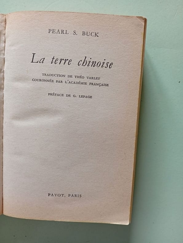 La Terre chinoise (The Good Earth) est un roman de Pearl Buck publié en 1931, récompensé par le Prix Pulitzer de la fiction en 1932 et par le prix Langlois de l’Académie française en 1933. Il s'agit du roman le plus vendu aux États-unis en 1931 et 1932. Il a été un facteur important pour l'attribution à Pearl Buck du Prix Nobel de littérature en 1938. C'est le premier livre d'une trilogie qui comprend Les Fils de Wang Lung (Sons, 1932) et La Famille dispersée (A House Divided, 1935). Jolie reliure vol. in-8, 180x120, relié demi cuir, bien frais, très bel exemplaire, 375p + catalogue. Couvertures conservées. Paris, Payot, 1947 ref/224