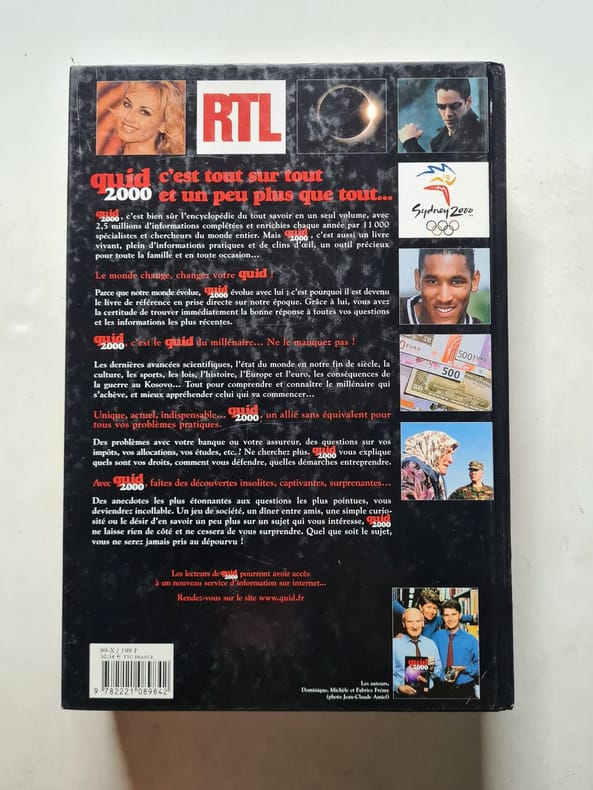 Robert Laffont 1999 19 4x5 2x27 8cm. 1999. Relié. Le Quid 2000 est une édition de référence de l'encyclopédie annuelle française rassemblant 2000 ans de connaissances et ouvrant sur le monde de demain. C'est un ouvrage complet et pratique conçu pour répondre à la curiosité sur tous les sujets utilisable en famille ou entre amis