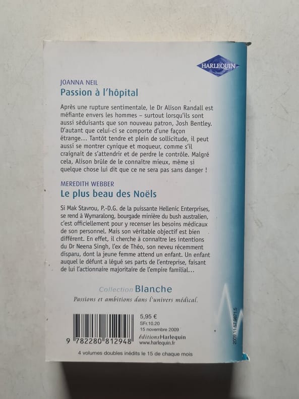 Harlequin Sans date. Le livre est un recueil de deux histoires de romance. La première "Passion à l'hôpital" de Joanna Neil suit le Dr Alison Randall méfiante après une rupture qui doit composer avec son nouveau patron séduisant et au comportement étrange Josh Bentley. La seconde "Le plus beau des Noëls" de Meredith Webber raconte comment Mak Stavrou PDG se rend dans une bourgade minière australienne sous un prétexte professionnel cachant un objectif personnel très différent