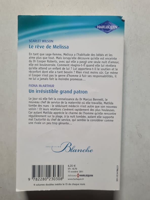 Harlequin Sans date. Melissa une sage-femme passionnée par son métier découvre qu'elle est enceinte à la suite d'une seule nuit passée avec le Dr Cooper Roberts son supérieur. Cette nouvelle bouleverse sa vie et promet de compliquer leur relation professionnelle et personnelle