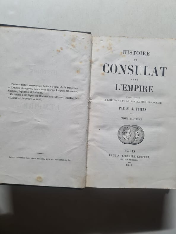 Paulin Libraire-Éditeur Sans date. Ouvrage historique monumental d'Adolphe Thiers publié entre 1845 et 1862 en 20 volumes qui retrace la période du Consulat et de l'Empire de Napoléon Ier faisant suite à son histoire de la Révolution française. L'auteur tout en manifestant une sympathie pour son sujet prétend conserver un jugement indépendant et critique
