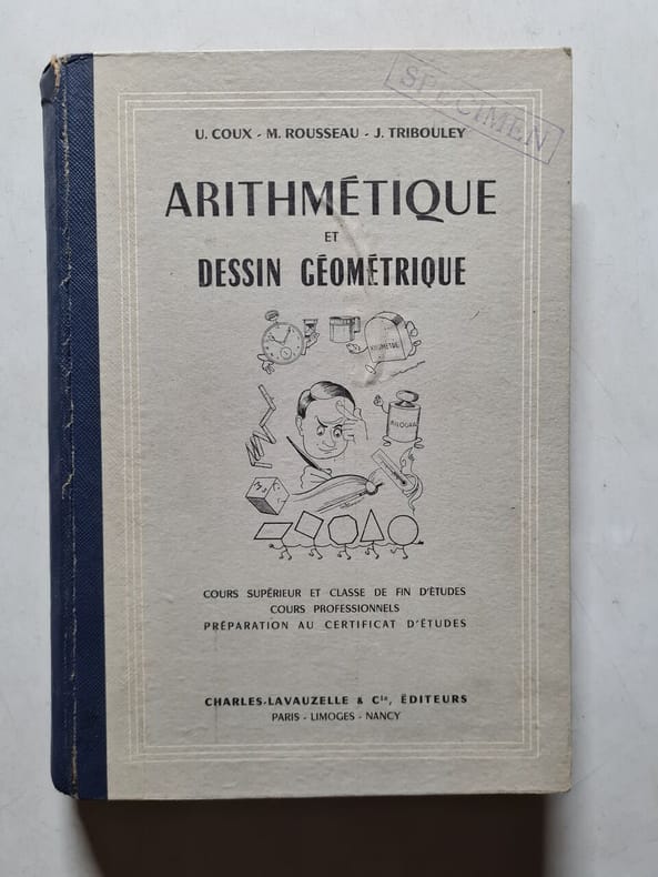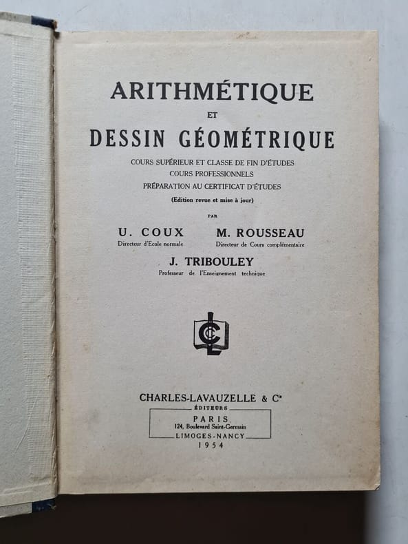 Charles-Lavauzelle & Cie Éditeurs Sans date. Manuel scolaire de 1954 destiné aux cours supérieurs et classes de fin d'études couvrant l'arithmétique appliquée et le dessin géométrique. Il vise à préparer les élèves aux cours professionnels et au certificat d'études dans une édition revue par les auteurs Coux Rousseau et Tribouley