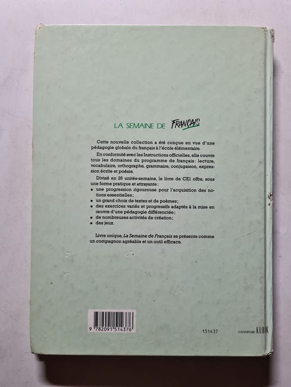 Nathan 1993 224 pages in4. 1993. relié. 224 pages. La Semaine de Français CE2 est un manuel unique conçu comme un compagnon d'apprentissage agréable et efficace. Il est divisé en 26 unités correspondant aux semaines de l'année scolaire présentant des activités de lecture et de français sous une forme pratique et attrayante