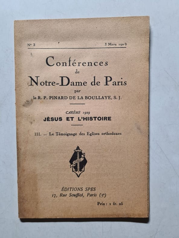 Éditions Spes Sans date. Ce livre rassemble les conférences de carême prononcées à Notre-Dame de Paris par le père jésuite Henry Pinard de la Boullaye probablement en 1929-1930. Il aborde des thèmes christologiques centraux comme le caractère du Christ l'accomplissement des prophéties la résurrection et propose une réflexion sur "Jésus et l'histoire" ainsi que sur "les christs païens". L'ouvrage publié en fascicules par les éditions Spes visait à toucher un large public par le biais de ces prédications