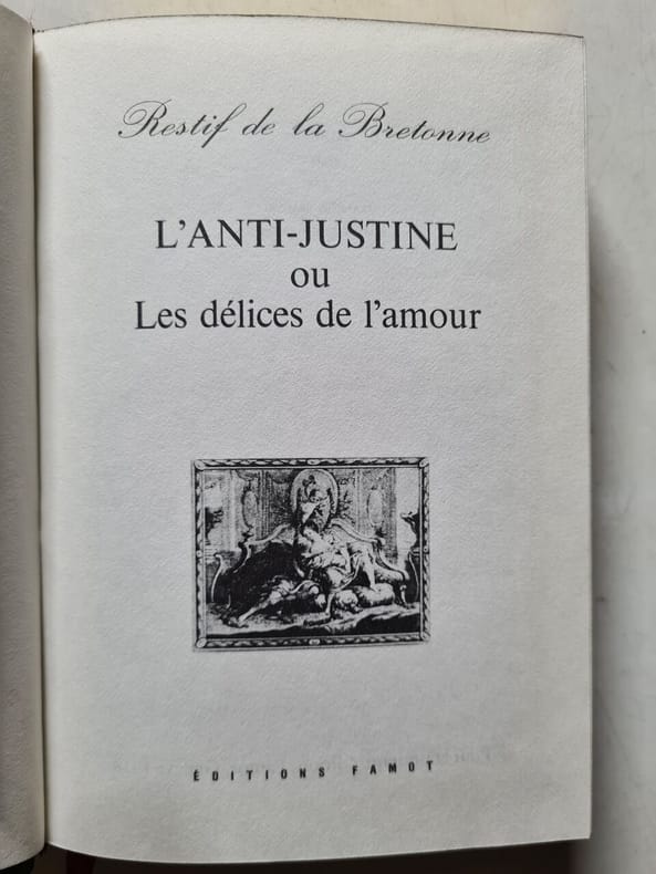 Éditions Famot Sans date. L'Anti-Justine ou les Délices de l'amour est un roman érotique de Rétif de la Bretonne publié en 1798. Présenté par l'auteur comme une réponse au marquis de Sade l'ouvrage se veut un érotikon célébrant le plaisir partagé en opposition aux tourments infligés aux femmes dans les œuvres sadiennes. Le livre est décrit comme une odyssée de débauche sexuelle souvent autobiographique qui rivalise pourtant avec Sade dans sa dépravation