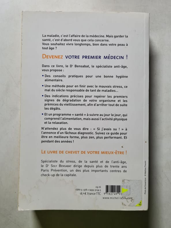 MICHEL LAFON 2016 317 pages 15x23 2x3cm. 2016. Broché. 317 pages. Ce livre du docteur Soly Bensabat propose une approche de médecine préventive où le lecteur apprend à devenir son propre premier médecin pour maintenir sa santé et ajouter des années de bien-être à sa vie. Il s'agit d'un guide pratique pour prendre en charge son mieux-être au quotidien