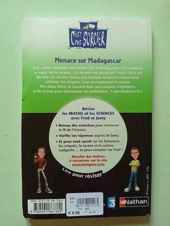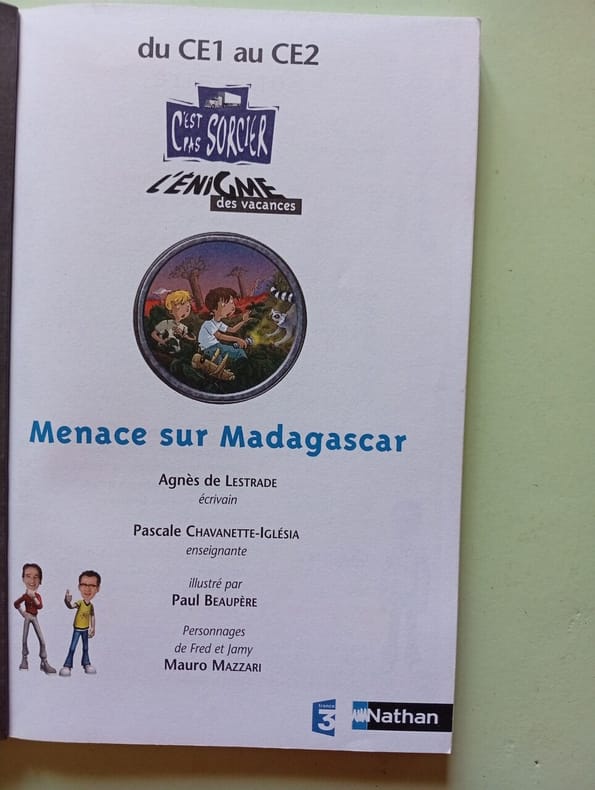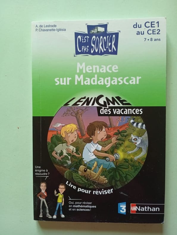 Nathan 2009 21x1 2x13 8cm. 2009. Broché. Zoé rejoint son cousin Tim à Madagascar et se retrouve plongée dans une enquête trépidante lorsque le dossier top secret de leur oncle Pat contenant une formule écologique pour éliminer les criquets est volé. Ce livre combine une histoire à suspense avec des exercices corrigés de maths français et sciences pour réviser les notions du CE1 au CE2 de manière ludique et autonome