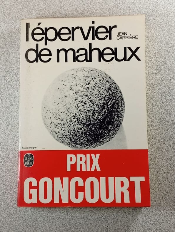 Lorsque les jurés du Goncourt choisissent de récompenser, le 20 novembre 1972, L'Épervier de Maheux au cinquième tour de scrutin, ils ne se doutent sûrement pas que ce livre va devenir le Goncourt le plus vendu de l'histoire : deux millions d'exemplaires achetés et quatorze traductions dans le monde ! Un immense succès, autant pour son auteur que pour le petit éditeur qu'est Jean-Jacques Pauvert, dont la réputation sulfureuse le tenait éloigné des récompenses. Le roman se déroule dans un hameau imaginaire, Maheux, situé avec précision dans les hautes Cévennes. Ce pays, apparemment ingrat, Carrière le transfigure d'emblée par une description somptueuse du cours des saisons avec sa dureté et ses beautés, avec le poids de « l'oppression minérale », du silence et de la solitude où l'homme vit durement dans une nature magnifique et impitoyable. Les anciens meurent, les fermes sont abandonnées les unes après les autres, les enfants quittent le pays : telle est l'atmosphère tragique d'une France anachronique qui meurt non loin de nous, décrite par un enfant des Cévennes de quarante-trois ans, encore peu connu et qui n'avait publié jusqu'alors qu'un premier roman, Retour à Uzès, resté confidentiel. Ce roman régional et rural touche et le monde de l'édition, et le public. Dans Le Figaro, André Brincourt écrivait : « Jean Carrière tirerait plutôt fierté de ses parentages. Loin de les dissimuler il les exhibe, il prend place au soleil et se mesure aux grands noms : Ramuz, Giono, Bosco, Chamson » (22 juillet 1972). Jean Freustié et Matthieu Galey, dans Le Masque et la Plume du 26 novembre 1972, perçoivent quant à eux ce Goncourt comme « une espèce d'aventure métaphysique » dans une écriture lyrique et musicale, « emphatique et belle » qui façonne un roman au-delà d'un simple récit sur la pauvreté de familles cévenoles. Mais ce succès aussi colossal qu'inattendu est une « catastrophe » pour l'auteur, qui sombre dans une profonde dépression. L'enfant des montagnes ne supportera pas d'être catapulté auteur à succès et de devoir fréquenter Paris dans une aventure irréelle et féérique mais qui ne lui fait ressentir qu'un malaise intérieur. Les Cévennes, l'été suivant, deviennent à la mode : des hordes de curieux souhaitent découvrir les sites du roman ; dès le mois de mai 1973, plusieurs randonnées et un « Week-end sportif et littéraire au pays de Maheux » sont organisés. Les élus locaux manifestent officiellement leur mécontentement et les critiques pleuvent sur Carrière, qui n'est pourtant à l'origine de rien. Touché au plus profond par ces vives critiques qu'il reçoit de la part de ses compatriotes cévenols, il cessera d'écrire et reviendra sur cet épisode douloureux quinze ans plus tard dans Le Prix d'un Goncourt, mettant en épigraphe cette phrase de Borges : « Le succès est un malentendu, le pire de tous peut-être ». Très bel exemplaire ; rare en grand papier et envoi.