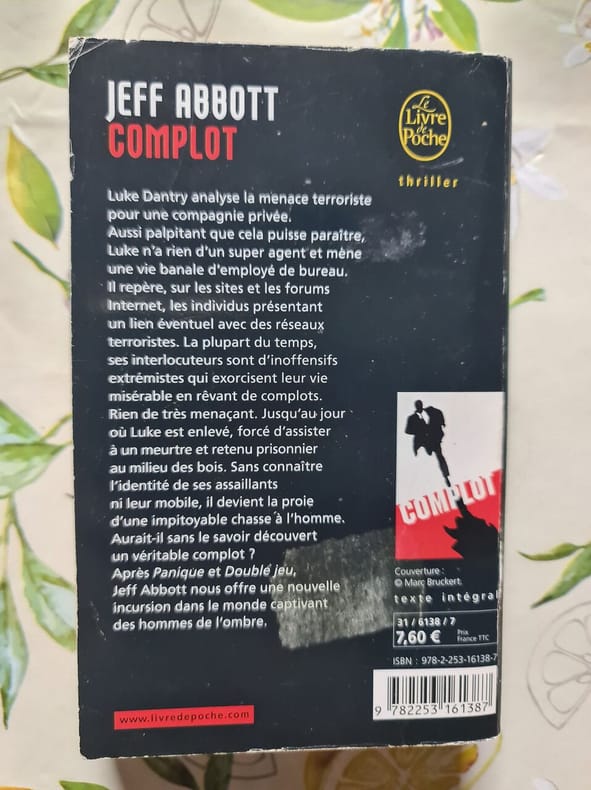 Le Livre de Poche 2012 552 pages poche. 2012. Poche. 552 pages. Ce roman de Jeff Abbott suite à 'Panique' et 'Double jeu' plonge à nouveau dans l'univers des services secrets et des complots. Le protagoniste semble avoir découvert sans en avoir conscience une conspiration réelle entraînant le lecteur dans une série de rebondissements palpitants