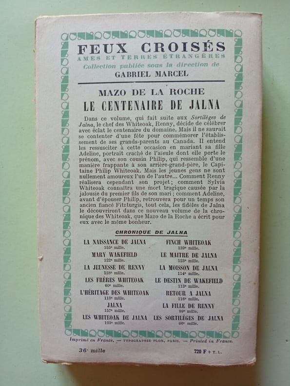 Librairie Plon 1958 1958. Quinzième volume de la saga des Whiteoak 'Le Centenaire de Jalna' est le dernier roman dans l'ordre chronologique de la série. Il évoque le souhait de Renny l'actuel maître du domaine de Jalna de voir la propriété retourner entre les mains d'une Adeline et d'un Philip après sa mort perpétuant ainsi la lignée familiale