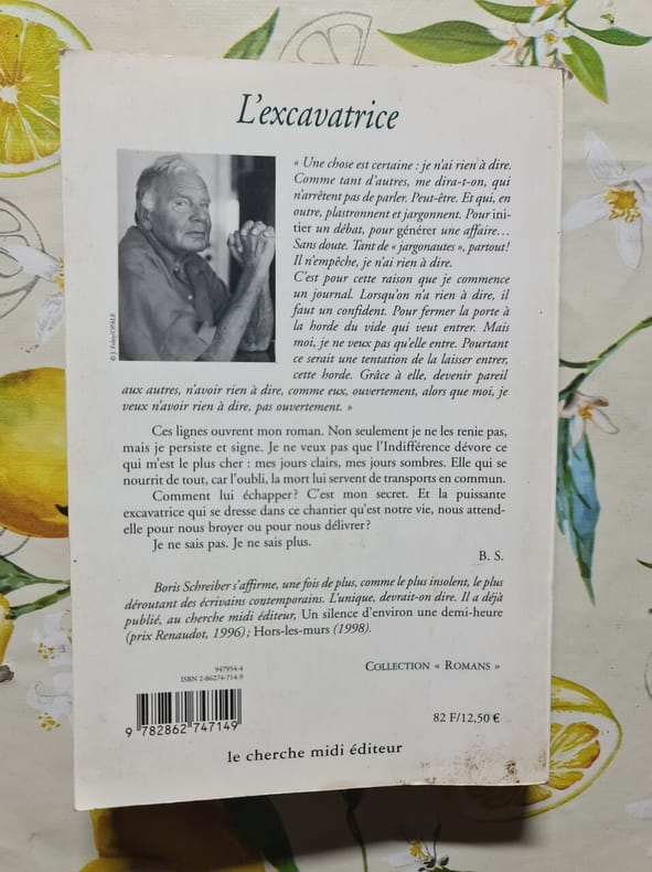 "LE CHERCHE MIDI EDITEUR. 2000. In-12. Broché. Bon état, Couv. convenable, Dos satisfaisant, Intérieur frais. 196 pages. Envoi de l'auteur sur la page de faux titre: Au le professeur Jean B..., avec ""l'excavatrice"" et toute mon admiration, Boris Schreiber.. . . . Classification Dewey : 840.091-XX ème siècle"