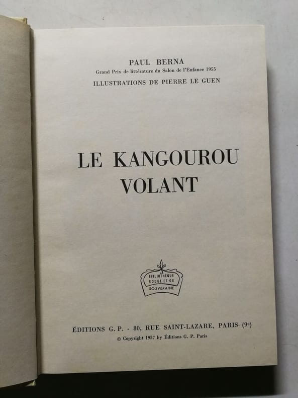 ÉDITIONS G. P Sans date. Le Kangourou volant est un roman policier pour la jeunesse écrit par Paul Berna publié en 1957 et illustré par Pierre Le Guen. L'auteur figure importante du polar jeunesse des années 50-70 y emploie un style volontairement familier et novateur pour son époque