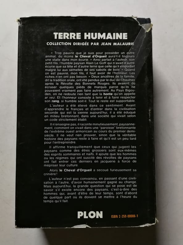 Plon Sans date. Publié en 1975 dans la collection Terre Humaine (Plon) "Le Cheval d'Orgueil" est le récit autobiographique de Pierre-Jakez Hélias qui y raconte son enfance et dépeint minutieusement la vie les traditions et le code social de la société bretonnante du pays Bigouden dans la première moitié du XXe siècle. L'ouvrage vendu à plus d'un million et demi d'exemplaires est devenu un classique pour sa valeur ethnologique et son témoignage sur une culture et une époque