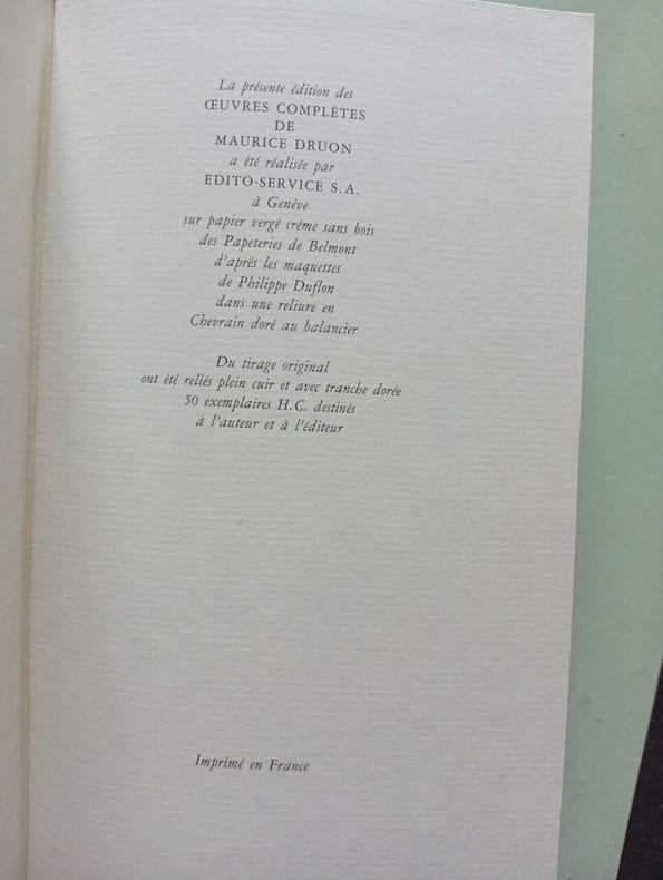 Serviço Edito-Serviço 1972 1972. Les Œuvres complètes de Maurice Druon rassemblent en 24 ou 25 volumes l'intégralité de la production littéraire de l'auteur incluant ses cycles romanesques majeurs 'Les Grandes Familles' (décrivant la société contemporaine) et 'Les Rois maudits' (fresque médiévale) ainsi que des discours et textes politiques inédits. Cette édition de collection réalisée par Édito-Service à Genève vers 1972-1975 est présentée comme un outil pour les bibliophiles souhaitant reconstituer ou compléter leur collection