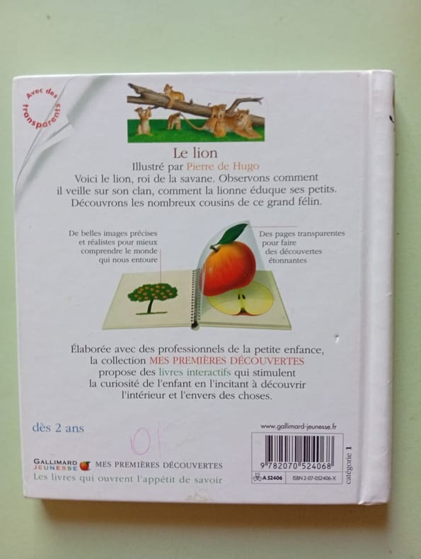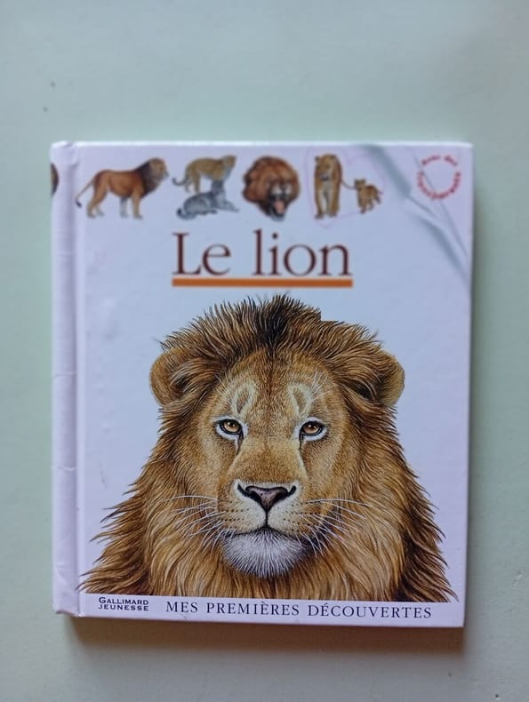 Editions Gallimard 1999 15 6x0 8x17 2cm. 1999. Relié. Ce livre documentaire illustré présente le lion roi de la savane en décrivant sa vie sociale la protection de son clan l'éducation des lionceaux par la lionne et ses techniques de chasse. Il permet également de découvrir les autres animaux de son environnement et les différentes espèces de félins qui lui sont apparentées grâce à des pages transparentes interactives