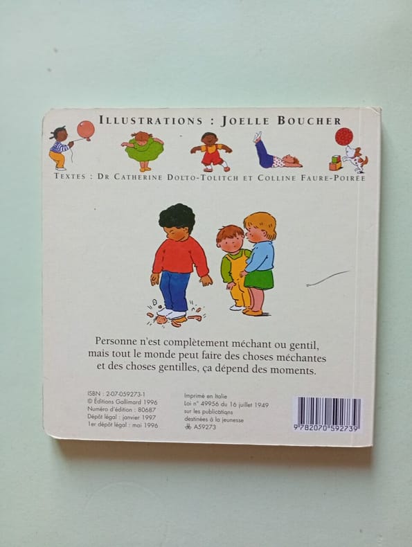 Giboulées 1996 10 pages 16x16x1cm. 1996. Album. 10 pages. Cet album documentaire de la collection 'Mine de rien' explique aux jeunes enfants que personne n'est entièrement gentil ou méchant mais que chacun peut avoir des comportements variés selon les moments. Il aide à comprendre les sentiments et émotions qui sous-tendent les actions qualifiées de 'gentilles' ou 'méchantes' par les adultes