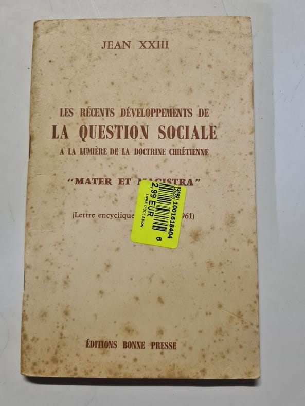 Lettre encyclique du 15 mai 1961. Annotation à l'encre sur un exemplaire n'altérant pas la lecture. Classification Dewey : 260-Théologie sociale chrétienne