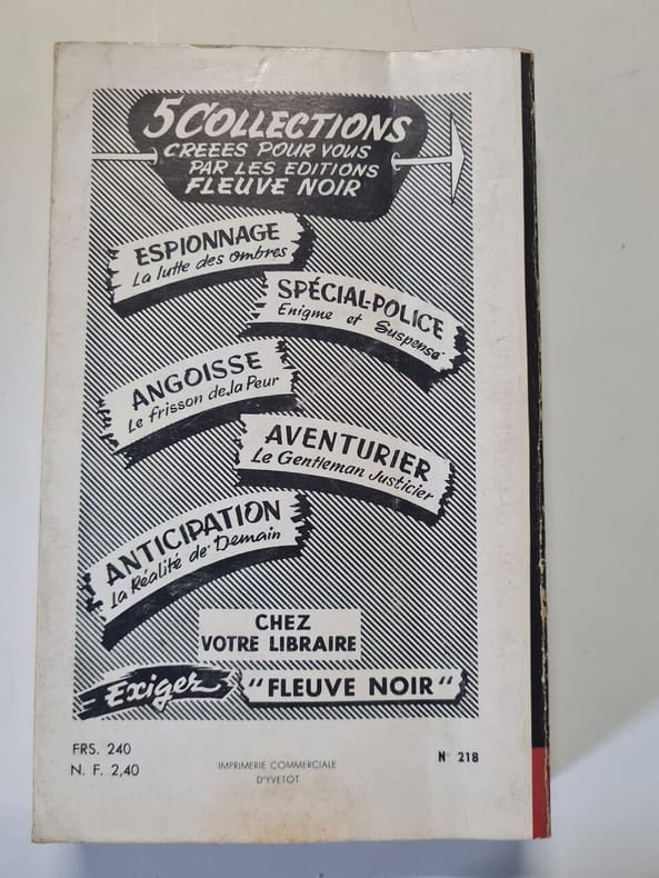 "EDITIONS FLEUVE NOIR COLLECTION "" ESPIONNAGE "" N° 218. 1959. In-12. Broché. Bon état, Couv. convenable, Dos satisfaisant, Intérieur frais. 219 pages.. . . . Classification Dewey : 843.0872-Le roman policier"