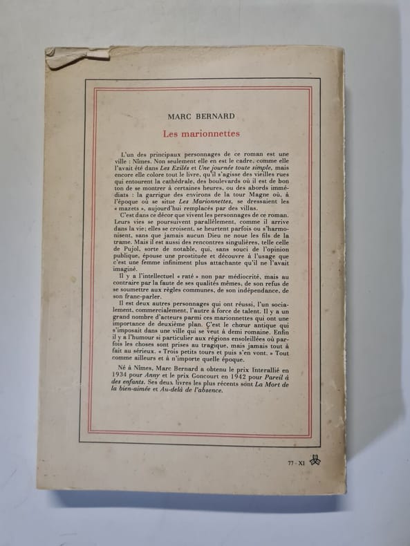 GALLIMARD Sans date. Le roman 'Les Marionnettes' de Marc Bernard utilise la ville de Nîmes comme cadre principal influençant l'atmosphère de l'œuvre à travers la description de ses vieilles rues de ses boulevards et de la garrigue environnante
