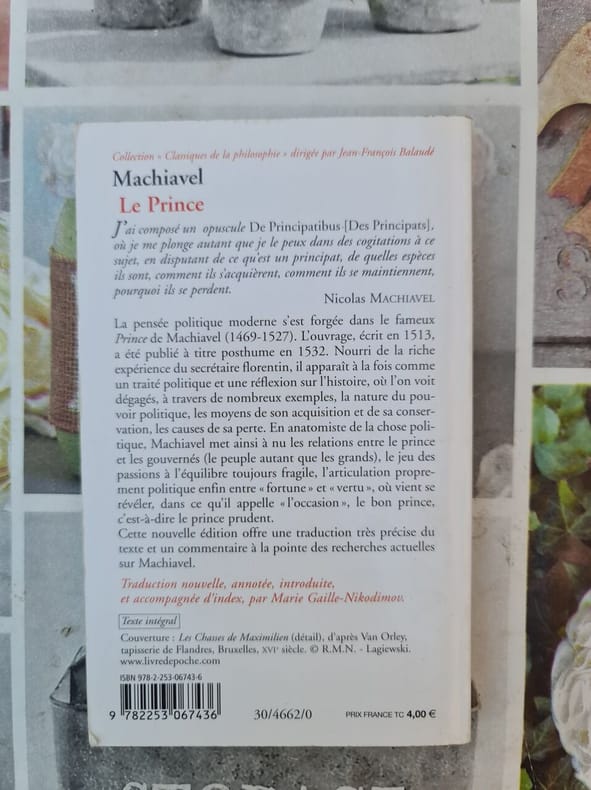 Le Livre de Poche Sans date. Le Prince de Machiavel est un traité politique qui conseille aux dirigeants d'être lucides et de résister aux apparences trompeuses pour gouverner efficacement en cherchant un équilibre fragile dans l'exercice du pouvoir