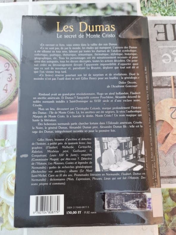 "L'histoire de Dumas père (Les trois mousquetaires) et fils (La dame aux camélias) et de leurs ascendants, depuis les Davy de la Pailleterie, nobles normands devenus négriers au XVIIIe siècle : le général de la République, les Dumas écrivains. Monte Cristo recèle le secret de l'origine noire de la famille : Dumas père souffrit du racisme et tenta de s'en délivrer par l'écriture." Exemplaire agrémenté d'un envoi autographe de l'auteur.