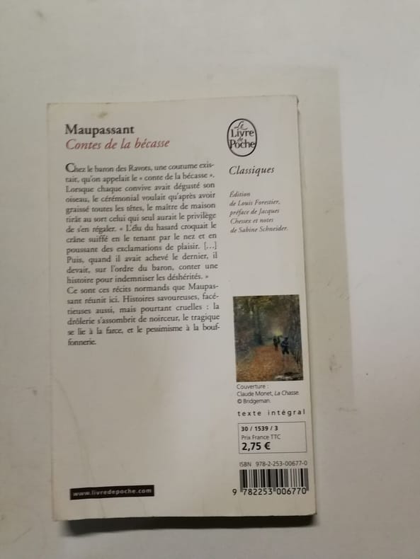 Le Livre de Poche Sans date. Recueil de seize nouvelles normandes de Guy de Maupassant structuré autour d'un rituel de chasse où le convive désigné pour manger la tête de bécasse doit raconter une histoire. Ces récits mêlent drôlerie et noirceur tragique et farce reflétant le pessimisme caractéristique de l'auteur