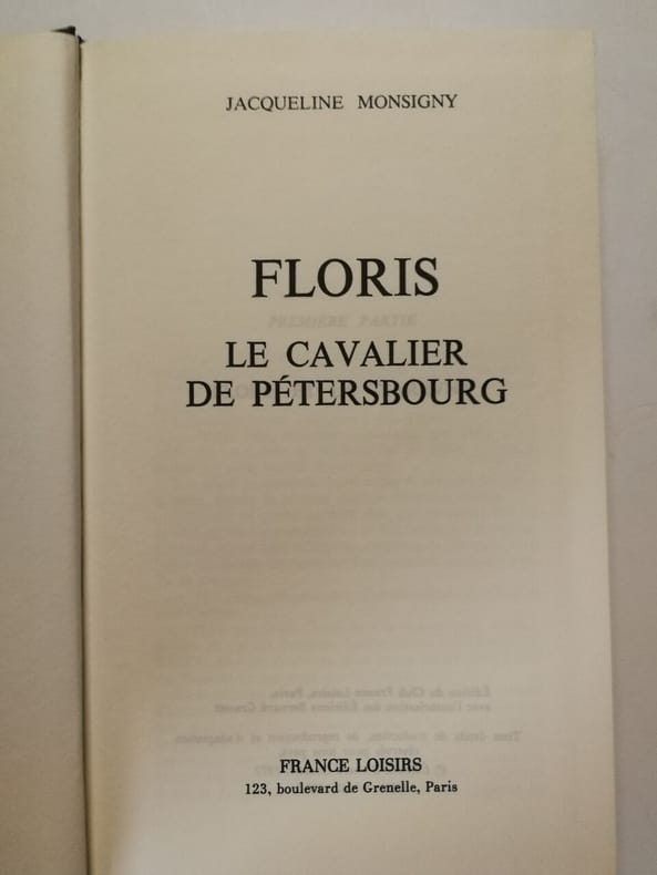 France Loisirs Sans date. Floris est le premier tome d'une série romanesque en quatre volumes écrite par Jacqueline Monsigny publié par France Loisirs en 1981. La série "Les Floris" suit les aventures et les passions d'une famille avec des intrigues se déroulant dans des cadres historiques variés comme la Louisiane et Saint-Pétersbourg