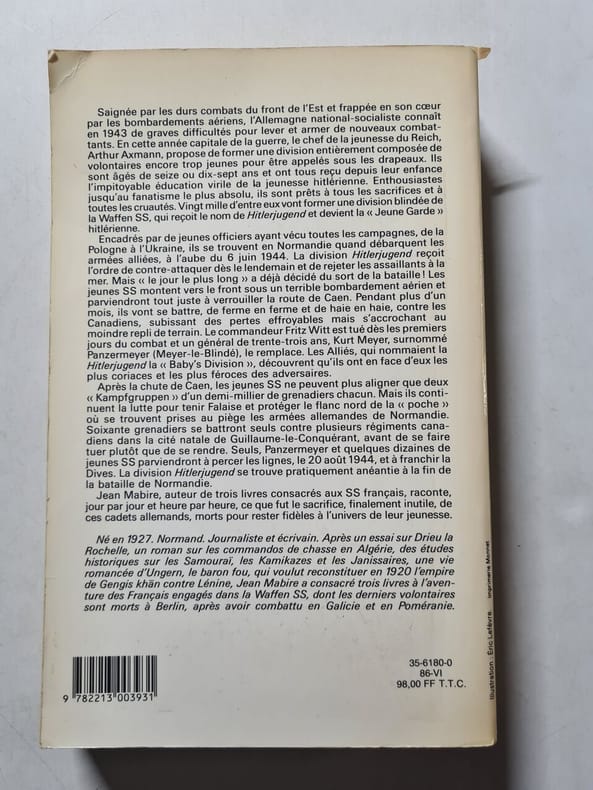 Fayard Sans date. Ce livre de Jean Mabire retrace l'histoire de la division SS Hitlerjugend composée de très jeunes soldats lors de la bataille de Normandie en 1944. Il décrit leurs combats désespérés leurs pertes effroyables et leur courage face aux armées alliées notamment canadiennes dans la région de Caen et de Falaise