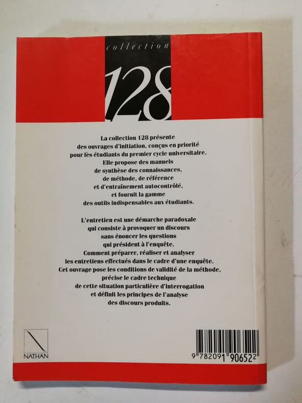 Nathan Sans date. Ce livre est un guide méthodologique qui explique comment préparer réaliser et analyser des entretiens dans le cadre d'une enquête en sciences humaines et sociales. Il pose les conditions de validité de la méthode détaille le cadre technique de l'entretien et propose des techniques d'analyse des discours