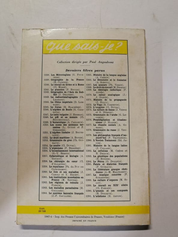 La première encyclopédie de poche fondée en 1941 par Paul Angoulvent, traduite en 43 langues, diffusée, pour les éditions françaises, à plus de 160 millions d'exemplaires, la collection Que sais-je? est l'une des plus importantes bases de données internationnales, construite pour le grand public par des spécialistes. 3800 titres ont été publiés depuis l'origine par 2500 auteurs. Classification Dewey : 610-Sciences médicales. Médecine