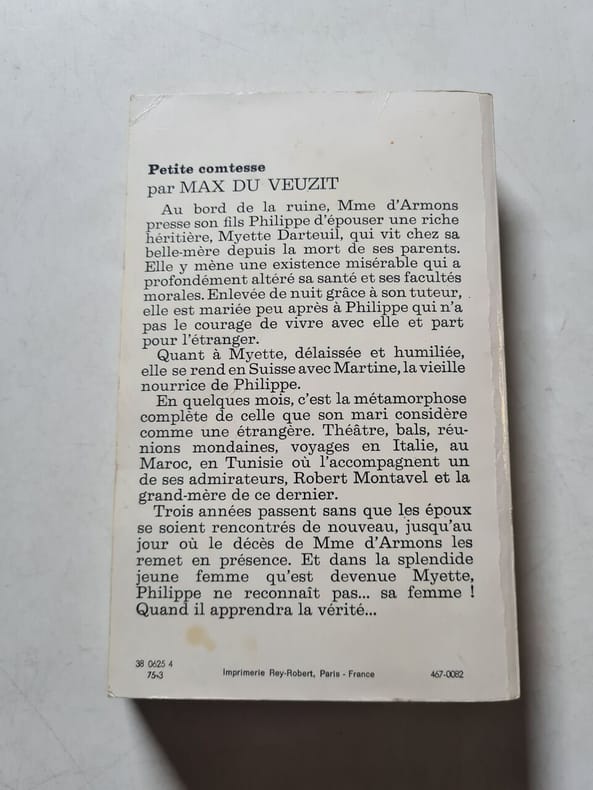 Tallandier Sans date. Myette Darteuil une jeune héritière orpheline vivant dans la misère chez sa belle-mère est contrainte d'épouser Philippe d'Armons pour sauver sa famille de la ruine. Le roman explore sa relation avec son mari et son passage d'une existence malheureuse à une possible rédemption par l'amour