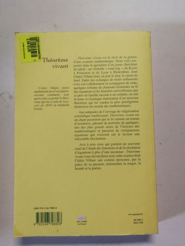 Grasset Sans date. Théorème vivant est un récit autobiographique dans lequel le mathématicien Cédric Villani relate ses années de recherche (2008-2010) consacrées à la résolution de l'énigme mathématique de l'amortissement Landau en collaboration avec Clément Mouhot. Écrit comme un carnet de bord il plonge le lecteur dans la vie quotidienne du chercheur mêlant idées scientifiques rencontres voyages doutes et vie personnelle